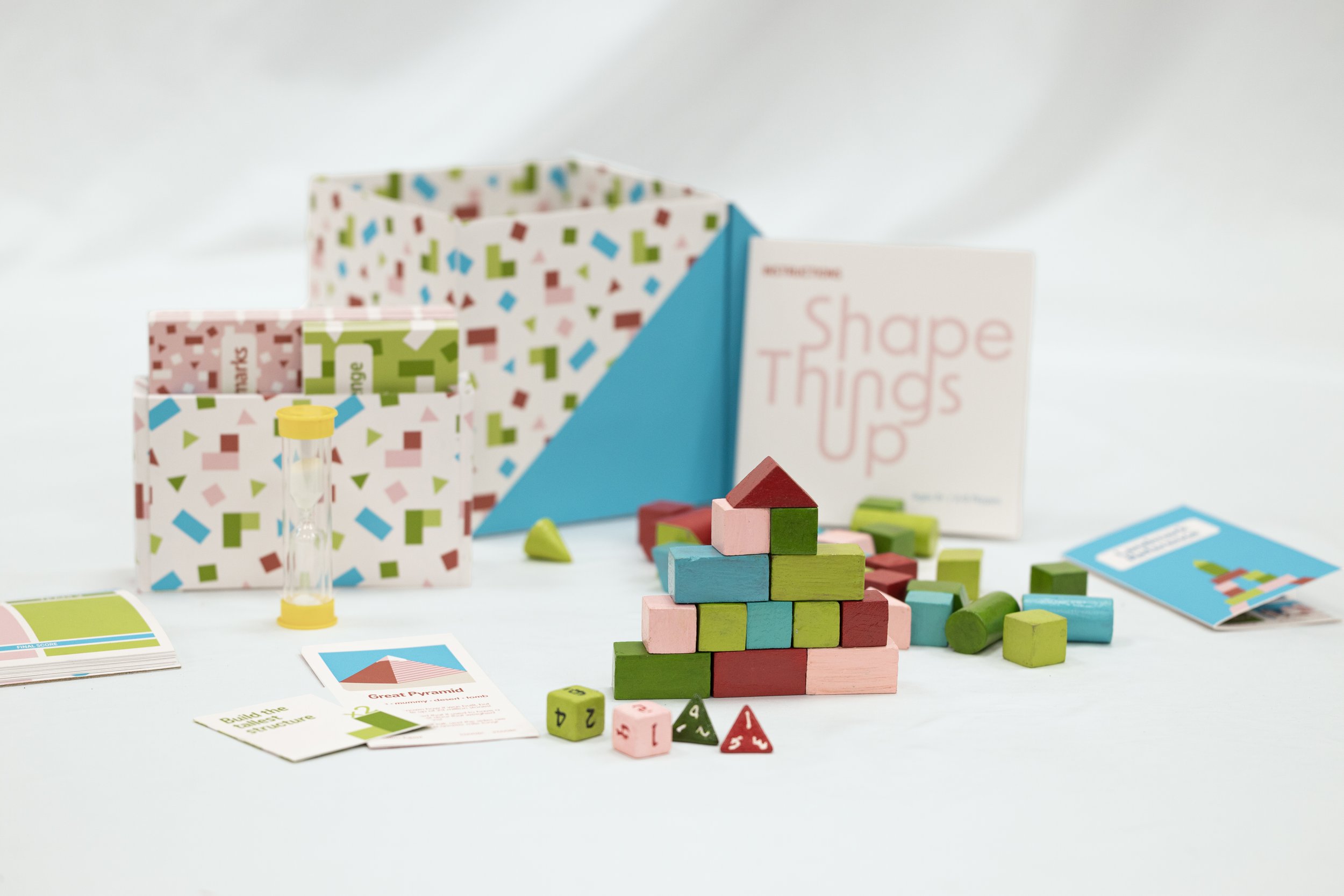 Shape Things Up is a game that uses block building and flat graphic illustrations to enjoy simultaneous learning and socialization. Players work to stack the different shapes into the landmark they pull, while others guess. The connecting geometric forms of the game’s branding emphasize how the individual pieces contribute to the final form as a whole.